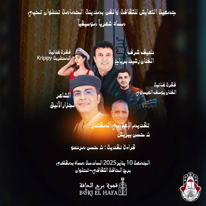 سيكون جمهور تطوان على موعد مع سهرة شعرية وفنية تُقام في مقهى برج الحافة الثقافي، يحييها أبرز الفنانين مثل يوسف العيساوي، والفنانة Krippy، والشاعر المبدع الجزار الأنيق، مع تقديم مقاطع موسيقية وأغانٍ ملتزمة.