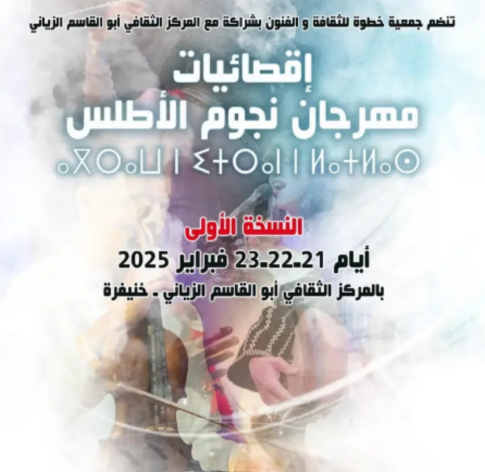 تنظم جمعية خطوة للثقافة والفنون بشراكة مع المركز الثقافي أبو القاسم الزياني بخنيفرة مهرجان نجوم الاطلس في النسخة الاولى، من 10 فبراير 2025 إلى 23 فبراير 2025 حيث ستعرف طيلة هذه أيام مهرجان عبر جولتين، مرحلة إقصائيات ومرحلة النهائيات، فيما ستنظم جمعية سهرة ختامية للمتوجين يوم 26 فبراير 2025.