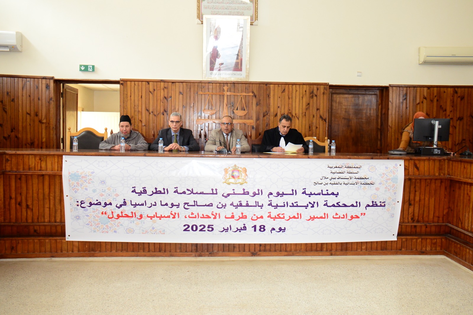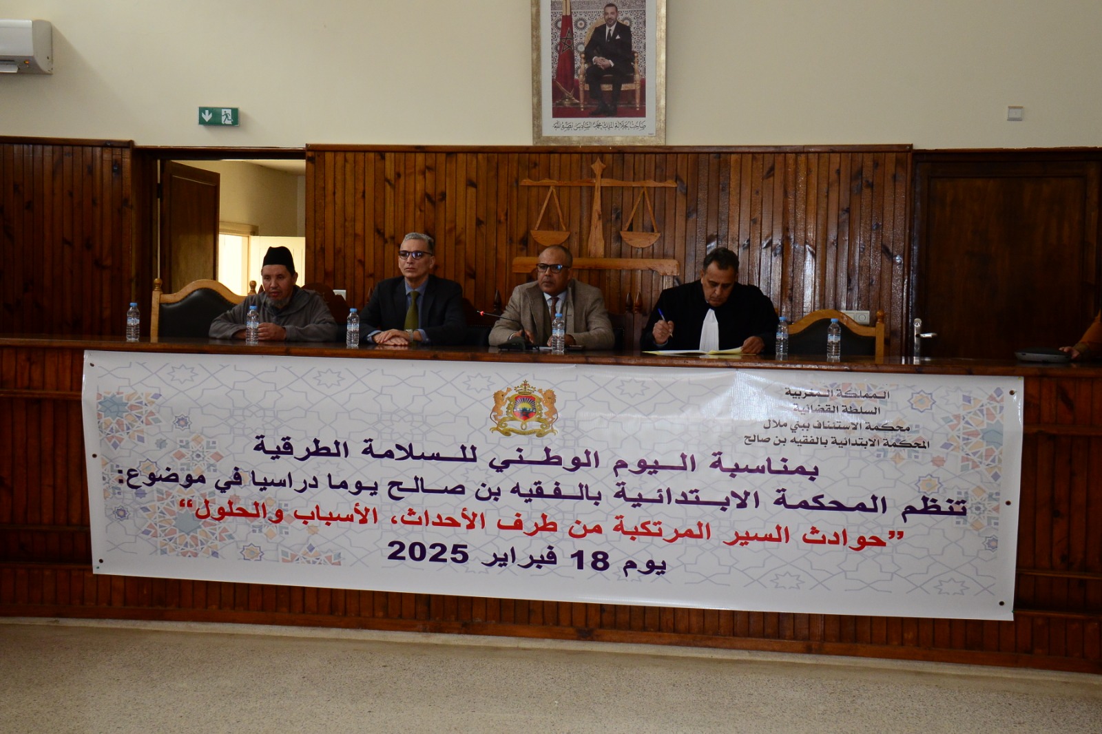 تخليدا لليوم الوطني للسلامة الطرقية، نظمت المحكمة الابتدائية بالفقيه بن صالح يومًا دراسيًا حول حوادث السير المرتكبة من طرف القاصرين، بحضور ممثلين عن الدرك الملكي، الأمن الوطني، المجلس العلمي، وتلاميذ المؤسسات التعليمية، في إطار الجهود الرامية إلى الحد من هذه الظاهرة المتزايدة التي تهدد أرواح المواطنين.