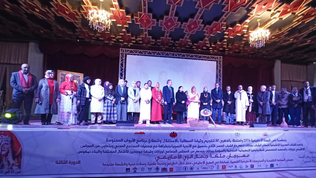 احتفاء بالتراث الأمازيغي الغني والعريق، و احتفالا بالعام الامازيغي 2974 واحتفالا بالذكرى 80 لتقديم الوثيقة المطالبة بالاستقلال، عاشت ساكنة ورزازات بقصر المؤتمرات مساء أمس السبت 20 يناير 2024 بمدينة ورزازات مع حفل اختتام فعاليات النسخة الثالثة من مهرجان ملكة جمال الزي الامازيغي الذي تنظمه دار الشباب الحسن الثاني تحت اشراف المديرية الإقليمية لقطاع الشباب بورزازات وبتنسيق وتعاون مع العديد من الشركاء عمالة ورزازات، المجلس الإقليمي لورزازات المجلس الجماعي لمدينة ورزازات جمعيات واندية المجتمع المدني، من 13 إلى غاية 20 يناير 2024، بحضور باشا مدينة ورزازات ورئيس المجلس الإقليمي لورزازات والمدير الإقليمي لقطاع الشباب بورزازات، والعديد من شخصيات وفعاليات المجتمع المدني بورزازات.