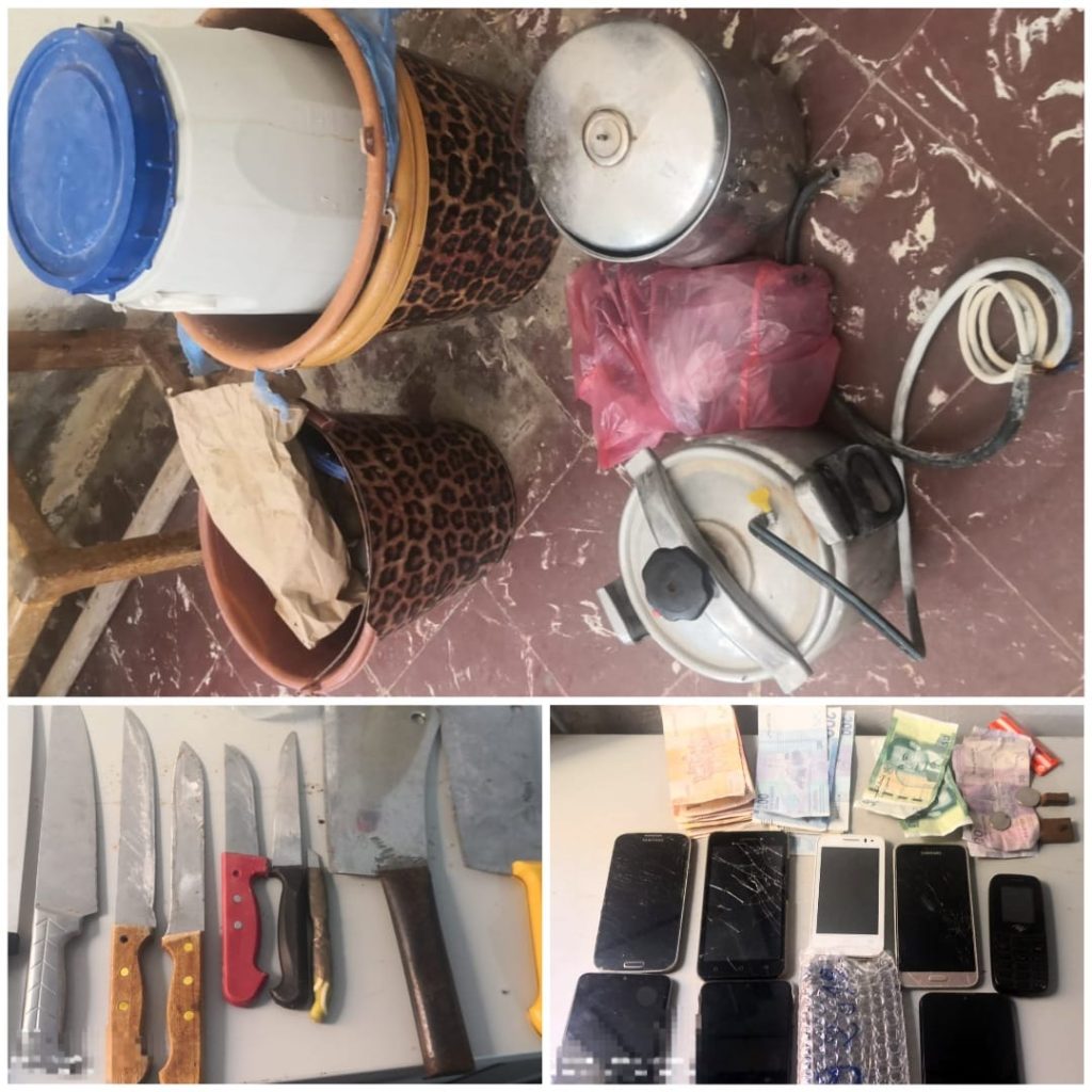وقد جرى إيقاف المشتبه فيه بعد إعداد كمين محكم له بالحي الحسني بمدينة السمارة، قبل أن تسفر عملية التفتيش التي أجريت في هذه القضية عن حجز تسعة أسلحة بيضاء عبارة عن ساطورين وسبعة سكاكين مختلفة الأحجام، علاوة على 75 لترا من المواد المخمرة، وكذا كمية من مخدر الشيرا موجهة للترويج، بالإضافة إلى مبلغ مالي يشتبه كونه من متحصلات هذا النشاط الإجرامي، وتسعة هواتف نقالة مشكوك في مصدرها، كما تم تفكيك معمل تقليدي خاص بتقطير مسكر ماء الحياة.