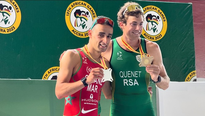 فاز البطل المغربي بدر سيوان بالميدالية الفضية في مسابقة الترياثلون ضمن النسخة الـ 13 من « الألعاب الأفريقية» التي أقيمت في أكرا عاصمة غانا، وجاءت مشاركة سيوان في ظروف جوية صعبة للغاية، حيث بلغت درجة الحرارة 35 درجة مئوية في الظل ونسبة الرطوبة 87 في مائة.