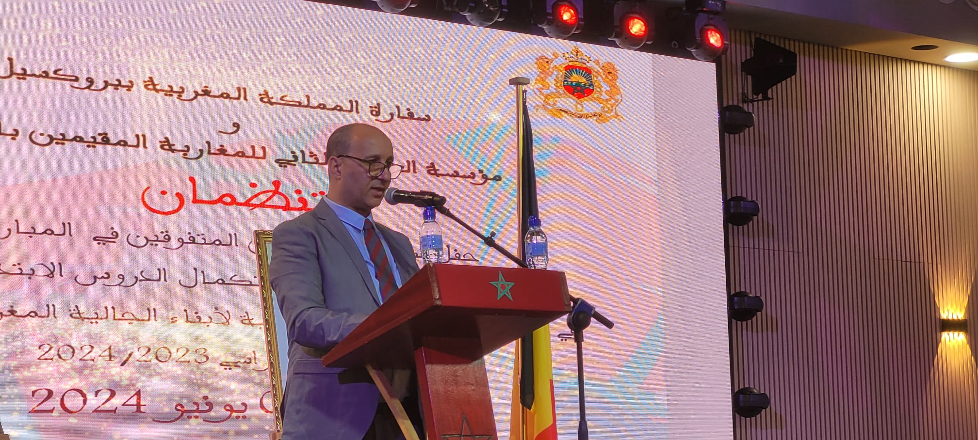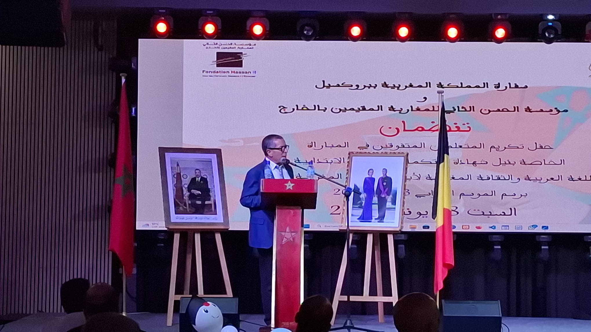 نظّمت المصلحة التعليمية بسفارة المملكة المغربية ببلجيكا والذوقية الكبرى للكسمبورغ و مؤسسة الحسن الثاني للمغاربة المقيمين بالخارج، النسخة الرابع عشرة من الحفل الّرسمي السنوي على شرف التلاميذ، من أبناء الجالية المغربية ببلجيكا، الذين تفوّقوا في الدورة الأخيرة لمباراة نيل شهادة الاعتراف باستكمال الدروس الابتدائية في اللغة العربية والثقافة المغربية وذلك بمدينة بروكسيل يومه السبت 8 يونيو 2024 وقد حضر الحفل السيّد محمد عامر، سفير صاحب الجلالة لدى المملكة البلجيكية والذوقية الكبرى للكسومبورغ ،مرفوقا بالسّادة القناصلة العامّين بقنصلتي بروكسيل ولييج ، ووفد رفيع عن مؤسسة الحسن الثاني للمغاربة المقيمين بالخارج ترأسته السيّدة نجوى روميجة مديرة بنية التربية والتعدّد بالمؤسسة التي كانت مرفوقة بالسيّدة فاطمة الزهراء اليحياوي، المسؤولة عن برنامج تعليم اللغة العربية والثقافة المغربية لأبناء الجالية المغربية المقيمين بالخارج، هذا وحضر الحفل ممثل المجلس الأوروبي للعلماء المغاربة.ورؤساء المؤسسات وكما جرت العادة والتقليد، وقف الجميع لتحيّة العلم على أنغام النشيد الوطنيّ المغربي، وذلك قبل أن يتناول السيّد السفير الكلمة، التي رحّب من خلالها بالضيوف وشكر مؤسسة الحسن الثاني و هنّأ المتفوقين وذويهم على النجاح المستحق، مثنيّا في ذات السياق على العمل المشرّف الذي تبدله البعثة التعليمية والثقافية المغربية المعتمدة لدى السفارة لفائدة مغاربة بلجيكا، مسترشدين في ذلك بالتوجيهات الملكية السّامية، التي تجسّد العناية الخاصّة التي يوليها جلالة الملك محمد السادس نصره الله لهذه الفئة العزيزة من الشعب المغربي، ونوّه السيد السفير بوجاهة وتأطير السيد يوسف الريّاني رئيس مصلحة التعليم بالسفارة كما أشاد وبحرارة بالمجهودات الجبّارة والتضحيّات التي يبذلها لصالح هذا الملف، وركّز معاليه على عمق ومتانة العلاقات المغربية البلجيكية وأكّد في ختام كلمته على عزم سفارة المملكة المغربية توسيع العرض التربوي الذي تقدمه البعثة ليشمل كافة المدارس البلجيكية مع دعم تواجد وخدمات أعضاء البعثة المغربية بمختلف الجمعيات التي تعنى بهذا النوع من التعليم لتتناول بدورها السيّدة نجوى روميجة الكلمة، التي استعرضت من خلالها مختلف البرامج التربوية والاجتماعية والروحيّة والقانونية التي تضطلع بها مؤسسة الحسن الثاني لفائدة المغاربة المقيمين بالخارج، مورِدة رزنامة من الاحصائيات المحيّنة التي تبرز محورية مسألة تعليم اللغة العربية والثقافة المغربية بالنسبة للمؤسسة بالخارج، مورِدة رزنامة من الاحصائيات المحيّنة التي تبرز محورية مسألة تعليم اللغة العربية والثقافة المغربية بالنسبة للمؤسسة وقد أوضح السيّد يوسف الريّاني في حديثه عن السيّاق العام لهذا النشاط الاشعاعي الذي تنفرد بتنظيمه البعثة التعليمية ببلجيكا، أنّه يأتي تتويجا لعمل دؤوب ومتواصل يقوم به أعضاء البعثة ويغطّي كلّ السنة الدراسيّة، كما أنّه يأتي بُعيد الدّورة الرابع عشرة التي اجتاز فيها المئات من المستفيدين والمستفيدات من خدمات أساتذة اللغة العربية والثقافة المغربية ببلجيكا، والمستوفين للشروط المطلوبة، مباراةَ نيلِ شهادة الاعتراف باستكمال الدروس الابتدائية.